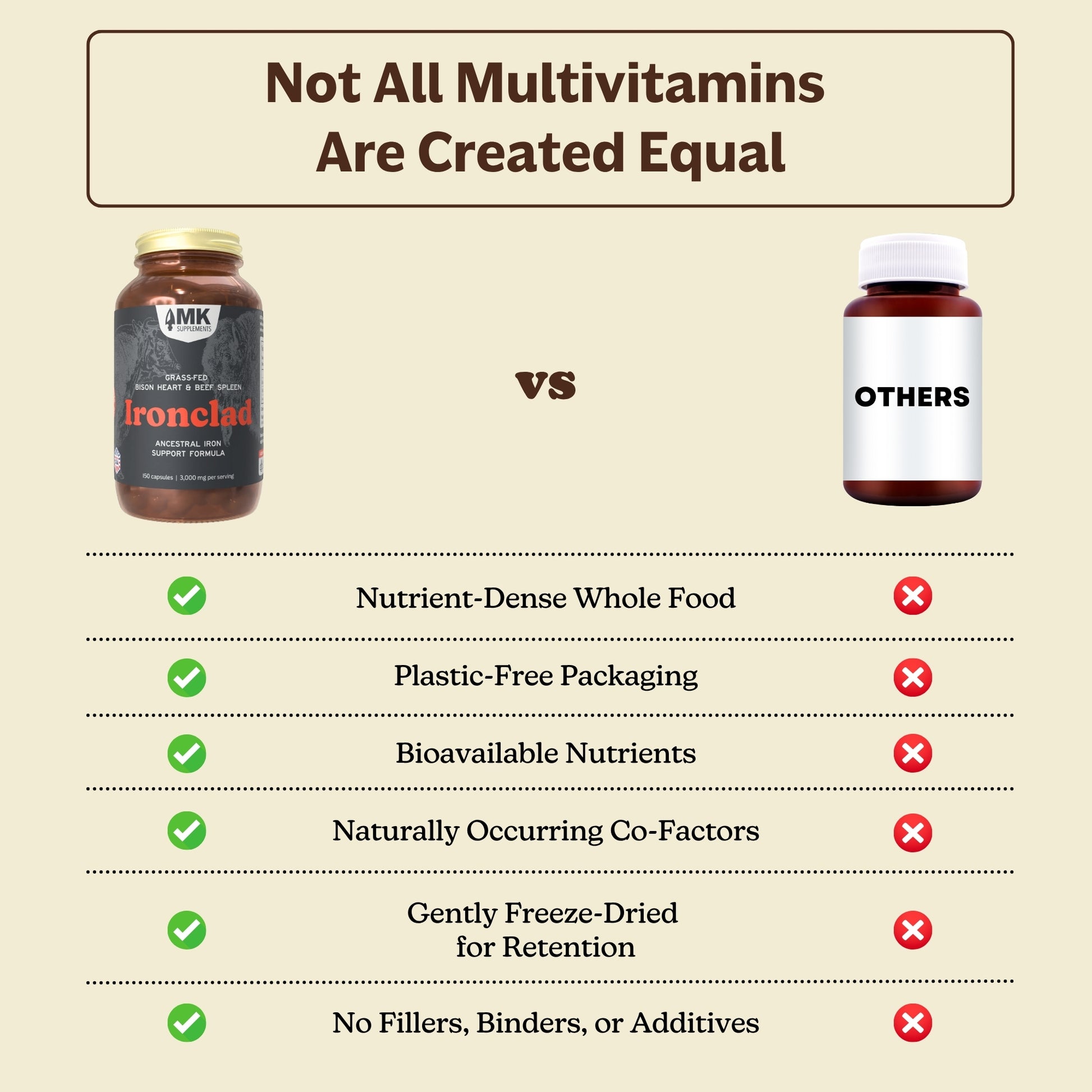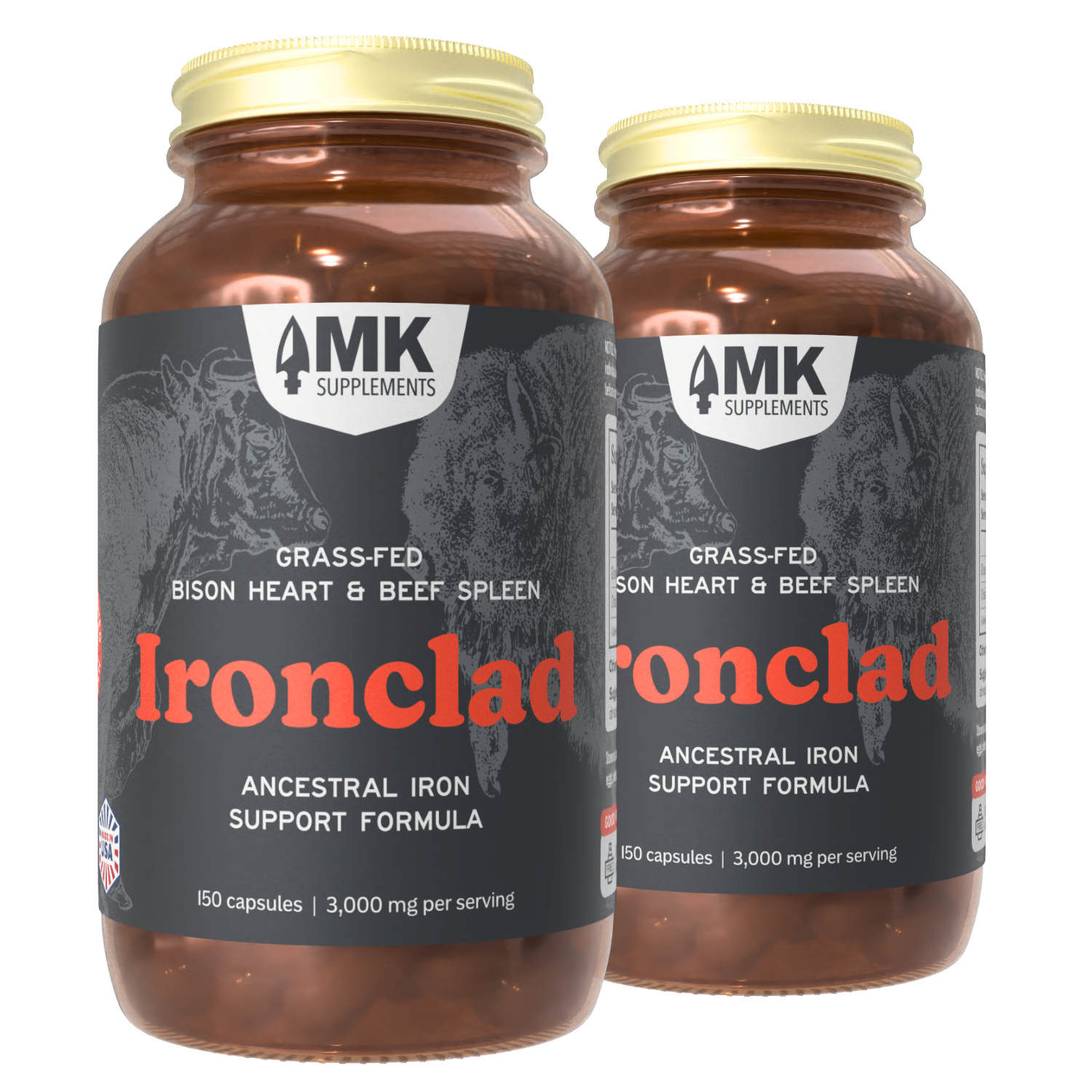 Heart and spleen have long been consumed for their role in resilience and recovery. Rich in heme iron, copper, and unique peptides, these organs supported our ancestors’ ability to endure long hunts, recover from exertion, and thrive in harsh environments. Ironclad builds on this tradition by pairing bison heart and beef spleen into a convenient, potent source of natural iron, cofactors, and peptides—fueling oxygen delivery, endurance, and recovery without the downsides of synthetic iron supplements.